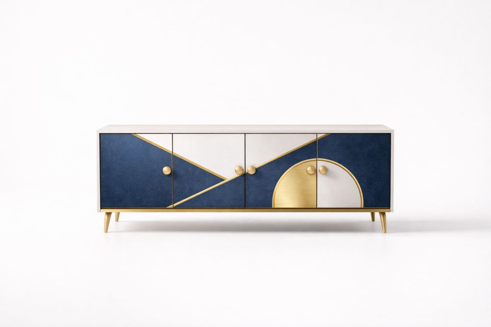 Meuble TV en MDF et acier Bleu/Blanc 160x45x50 cm